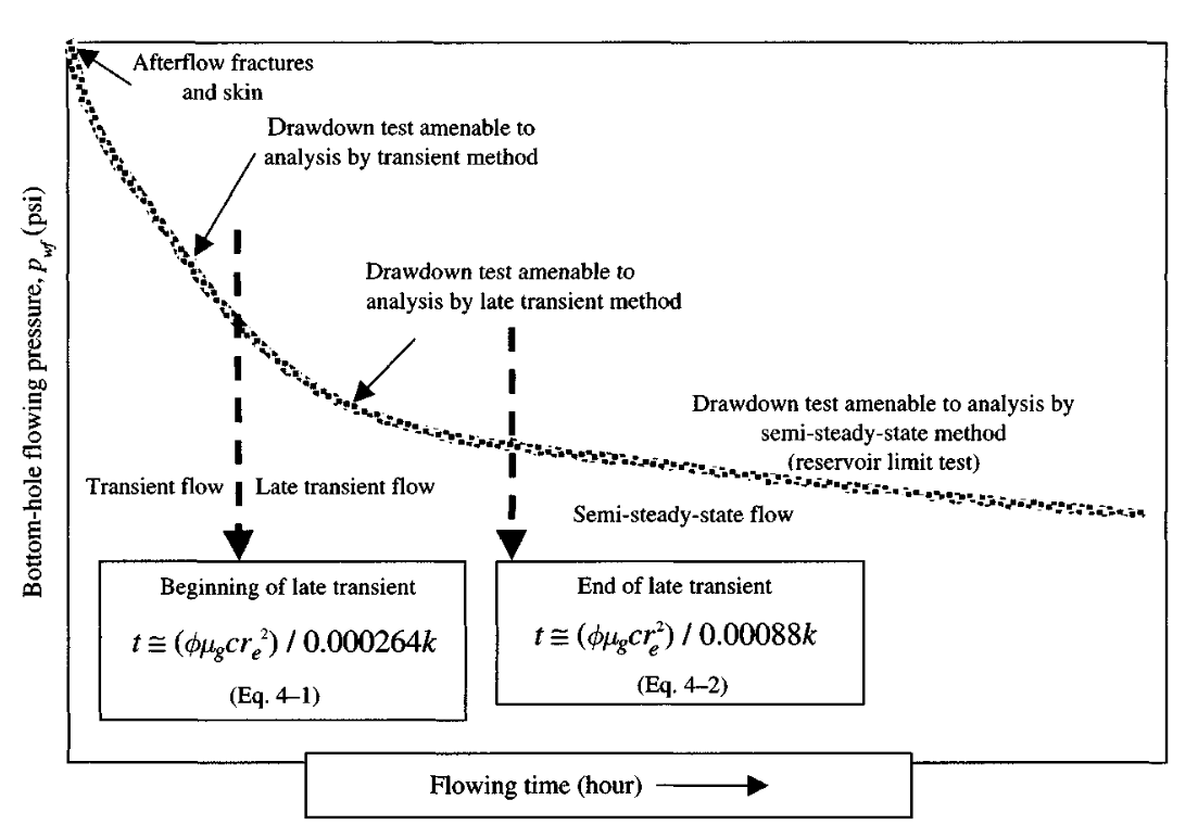 A pressure drawdown test is simply a series of bottom-hole pressure measurements made during a period of flow at a constant production rate. transient flow condition prevails to a value of real time approximately equal to: Semi-steady-state conditions are established at a time value of: